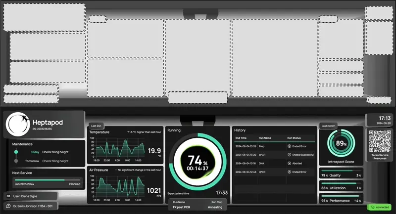 Die OneView™-Oberfläche von Veya™ ist nahtlos mit Tecan Introspect verbunden, einer digitalen Plattform zur Analyse der Geräteauslastung und Performance. Introspect liefert KPIs in Echtzeit und ermöglicht datenbasierte Entscheidungen zur Optimierung von Laborprozessen. Durch die Integration in Veya™ sind diese Analysen direkt im OneView™-Dashboard verfügbar.